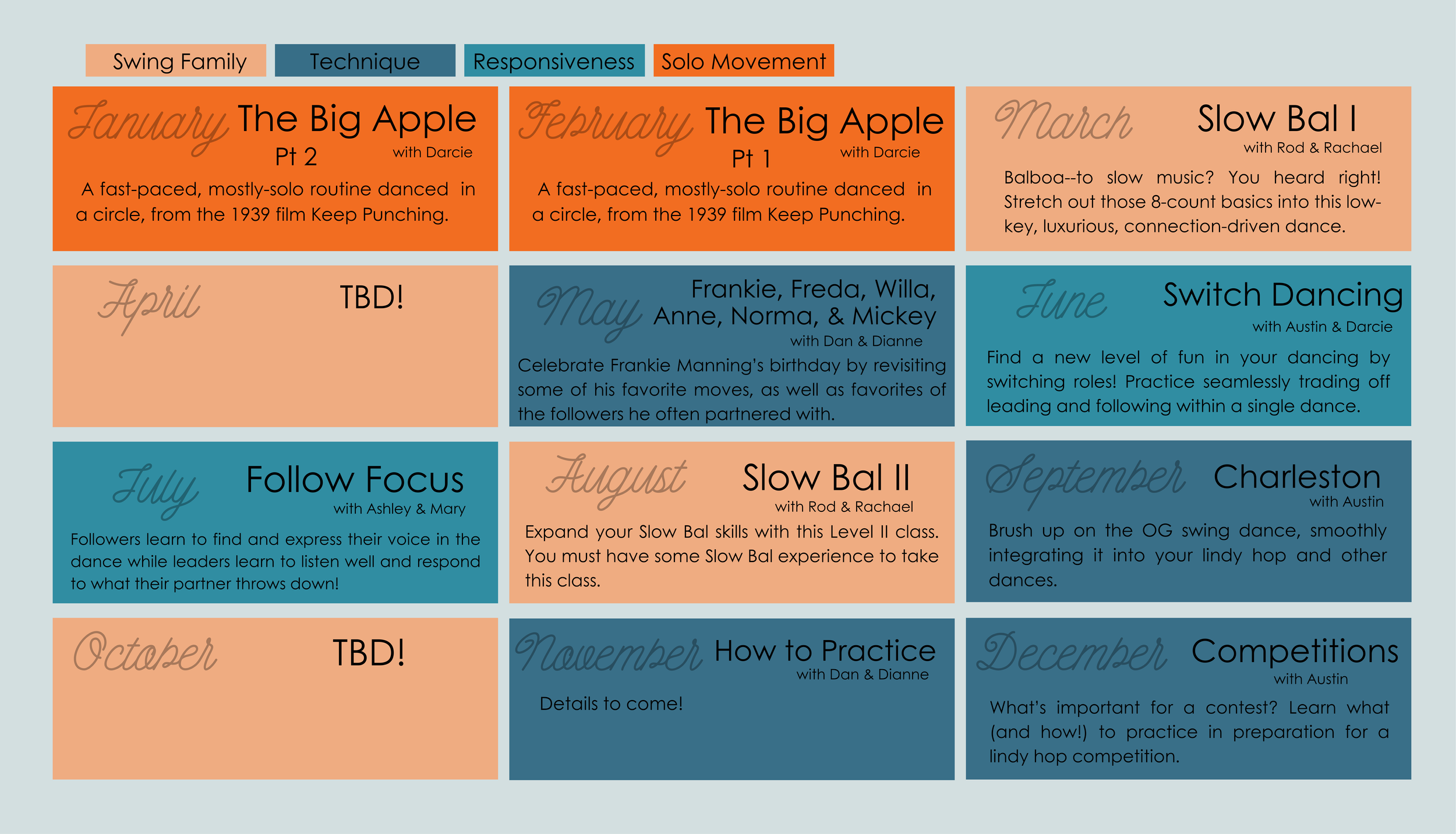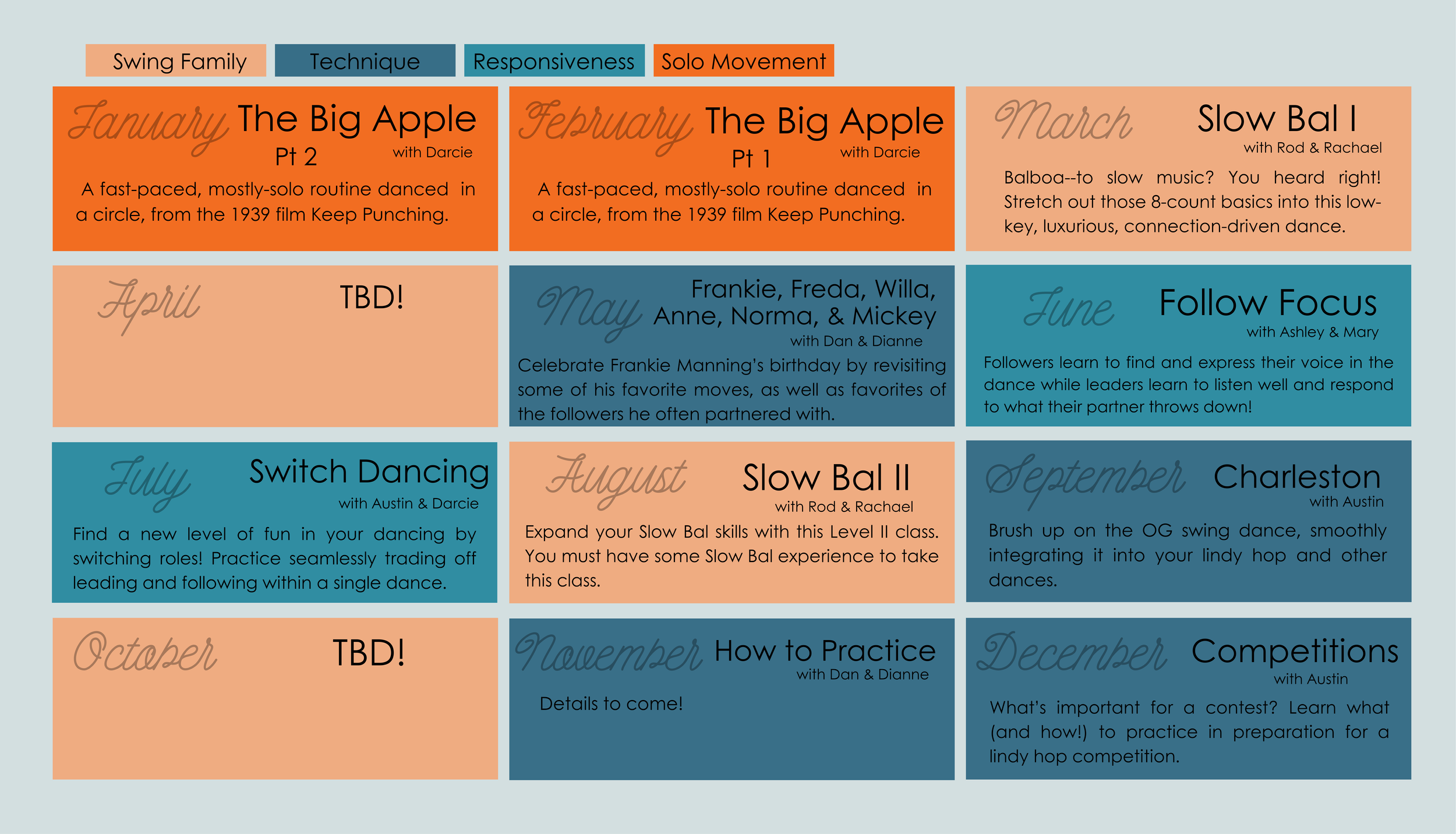 There is a lesson from 7-8 PM intended for dancers who are ready for a new challenge (typically NOT appropriate for folks who are brand new to the dance). Monday lessons are organized in a 4-5 week series with the topics developed by the teachers. Past topics have included: Jamming and Musicality, Conversational Lindy Hop, The Big Apple, Switch Dancing, and Intro to Balboa.